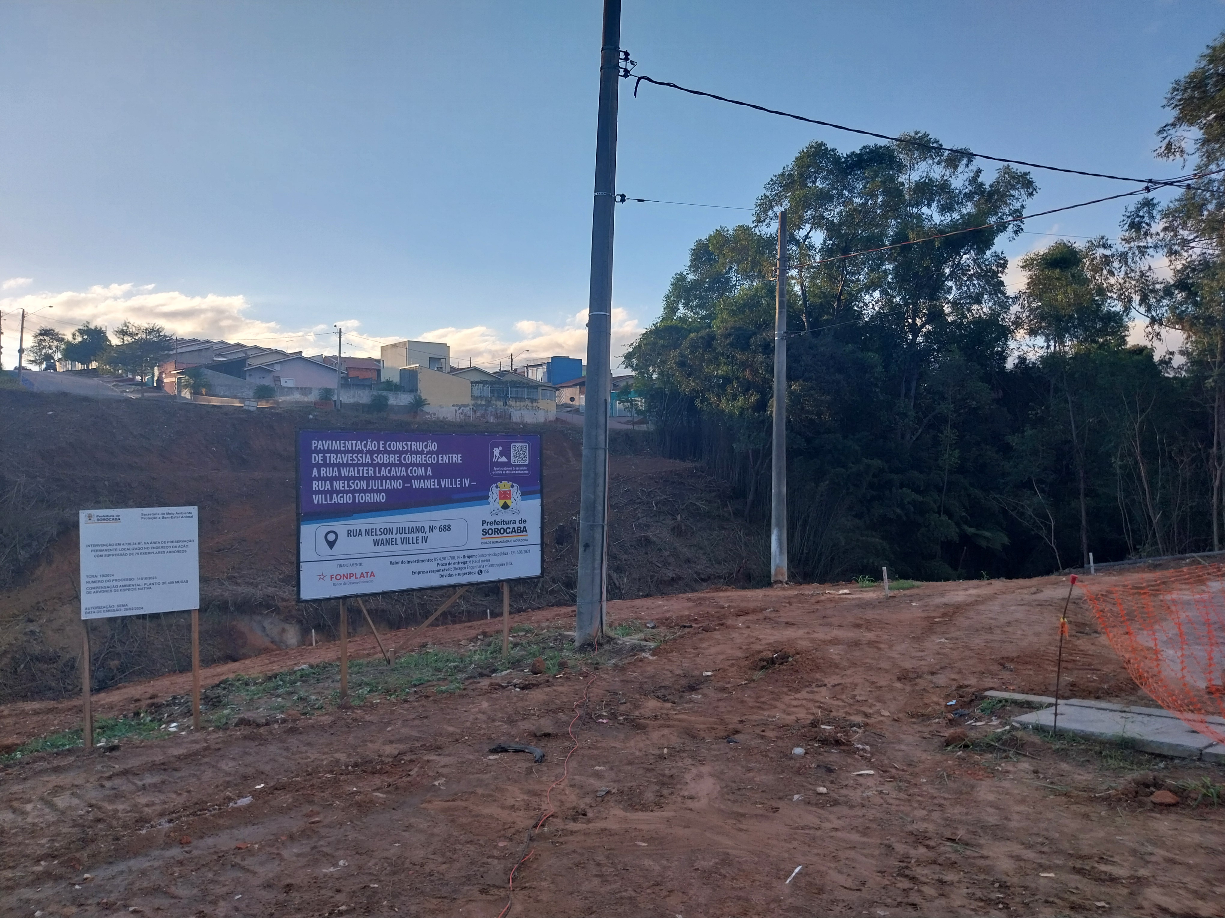 OBRA DE PAVIMENTAÇÃO E CONSTRUÇÃO DE TRAVESSIA SOBRE O CÓRREGO ENTRE A RUA WALTER LACAVA COM A RUA NELSON JULIANO - WANEL VILLE IV - VILLAGIO TORINO.